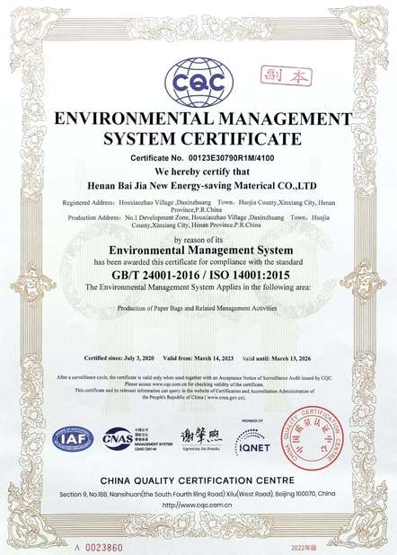 スタンダード:ISO 14001 番号:00120E31997R0M/4100 発行日:2023-03-14 有効期限:2026-03-13 範囲/範囲:Production of Paper bag and Related Management Activities で発行:CHINA QUALITY CERTIFICATION CENTER |