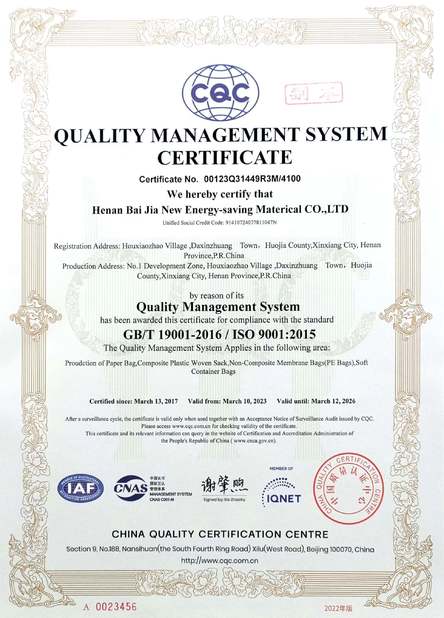 スタンダード:ISO9001 番号:00120Q34488R2M/4100 発行日:2023-03-10 有効期限:2026-03-12 範囲/範囲:Prodution of paper bags で発行:CHINA QUALITY CERTIFICATION CENTER |